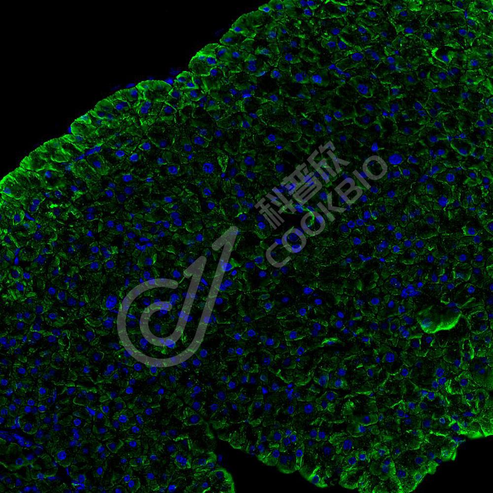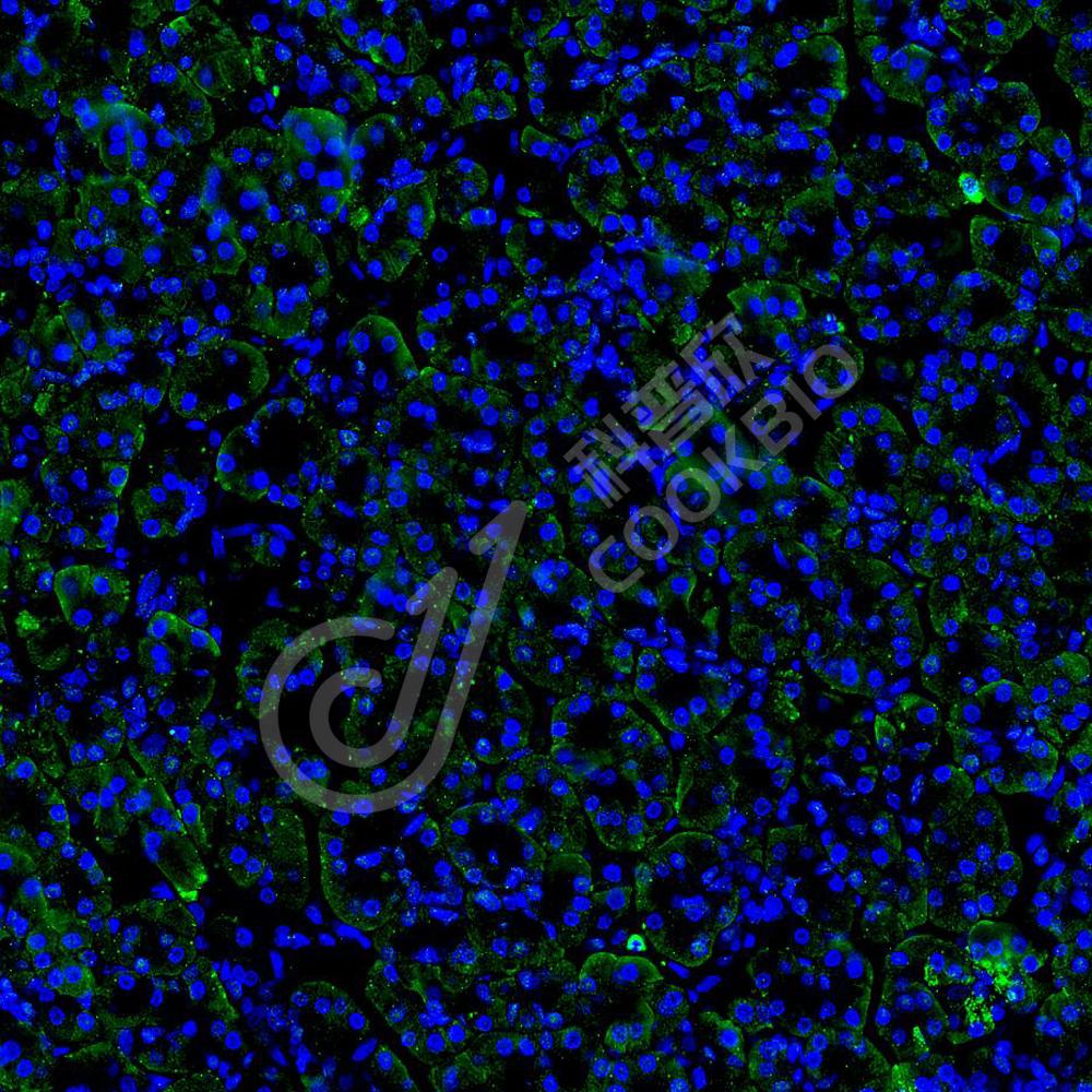 二抗: Alexa Fluor 488标记山羊抗兔IgG (H+L) (货号KB75909), 1: 400稀释, 室温孵育1小时.